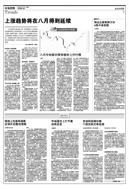 从技术上看,4月以来上证指数下跌800点,历时2个半月,本轮反弹理应在时间和空间上超过一半,即时间上达到8月中旬,空间上超过2700点。这是我们在8月投资策略中一种保守的分析,也就是说,8月行情仍将继续上涨。