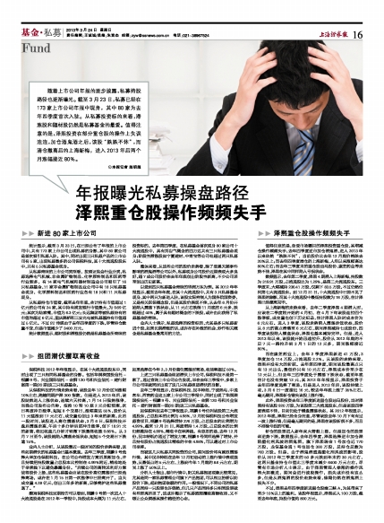 而在康芝药业上,去年2季度泽熙新进41万股,3季度加仓114万股,占流通股2.2%。从该股的走势来看,泽熙并没有大的斩获。去年第四季度,期间该股最高点只有13元出头,最低价只有10元左右,泽熙成本价至少在12元以上,但去年三四季度处于震荡下跌状态,截至年底估计也没有突破12元,其2012年年报显示,泽熙投资于去年四季度选择了离场。但是进入2013年后,该股持续上攻,3月6日一度接近16元,较去年年底上涨了35%左右。毫无疑问,泽熙斩仓错失该股上涨行情。