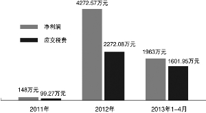 亿帆药业的情况与此类似。2013年1-4月,该公司实现净利不到2012年全年的两成,应交税费却超过2012年100余万元,其中包括企业所得税579.71万元,而2012年全年仅为511.66万元。
