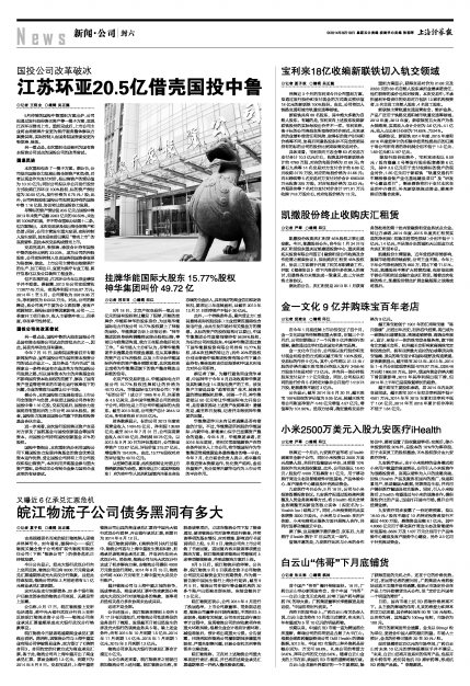 5月停牌的国投中鲁重组方案出炉,公司拟通过发行股份购买资产等一揽子方案,实现江苏环亚借壳上市。重组完成后,上市公司主业将由浓缩果汁变更为医疗服务整体解决方案提供商,实际控制人由国务院国资委变更为张惊涛、徐放。