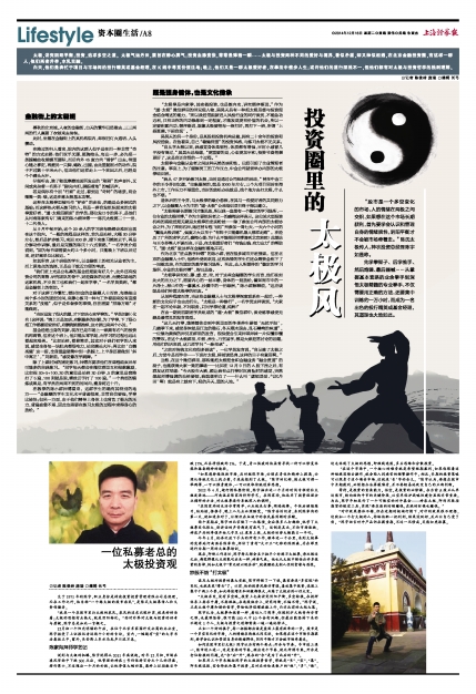 现在,即便工作再忙,陈宇每天都会至少抽半小时练习太极拳,每次练过之后,都觉得像从天然氧吧出来一样,神清气爽。他也从太极中顿悟出许多投资的真谛,例如太极中“常无欲以观其妙”,就提醒他克制人性的贪婪与恐慌。