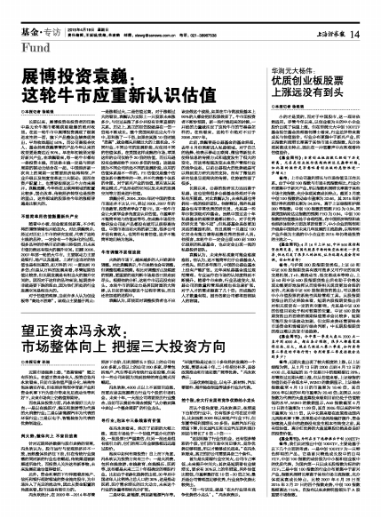 长期以来,展博投资在投资者的印象中是无论牛熊市都能获取稳健的绝对收益。在这一轮牛市中展博投资展现了极富进攻性的一面,旗下产品整体业绩表现突出,平均收益超过50%。而公司高级合伙人、基金经理袁巍掌管的产品今年以来的收益更是高达近90%。早在年初就坚定看好新兴产业,在袁巍看来,每一轮牛市都有一条投资主线,而这条主线一定是与经济周期的驱动力结合在一起。中国经济新一次向上的周期一定需要经济结构转型、产业升级以及制度变革这三大驱动;因而在资产配置上,也需要按照这三个方向来展开。袁巍透露,今年他在互联网领域的配置比较多,国企改革、传统经济转型也是投资的重点,这些领域的股票在今年的涨幅普遍是比较大的。