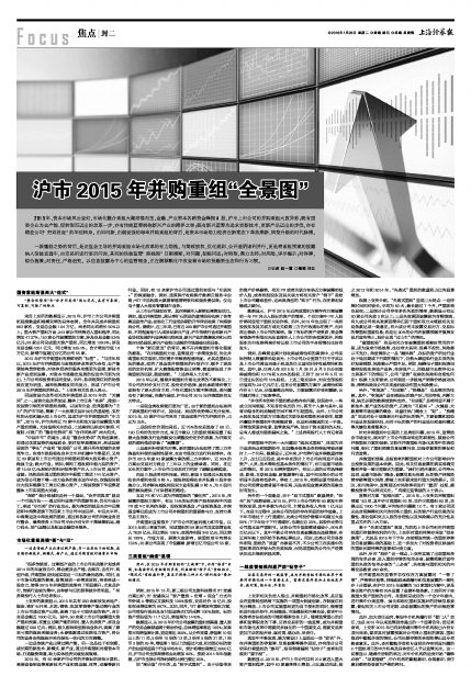 2015年,有40余家沪市公司的并购标的涉及计算机、高端设备制造等高新技术产业和类金融、体育、动漫等新兴行业。同时,有10余家沪市公司通过重组实现与“互联网+”的深度融合。例如,通策医疗收购医疗数据云服务平台商;*ST中昌收购大数据智能营销软件和服务提供商;仪电电子置入大股东智慧城市业务。