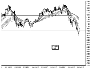 这仍然是上升趋势的一个重要变化,确立了新的下降趋势。顾比复合移动平均线(GMMA)的长期组均线已经收敛并拐头向下,而且正在形成充分发散,这确认了趋势的变化。显示出投资者的卖出活动越来越强烈。GMMA长期组均线的上边缘位于3195点附近的前期支撑位以下,这具有看空意味。