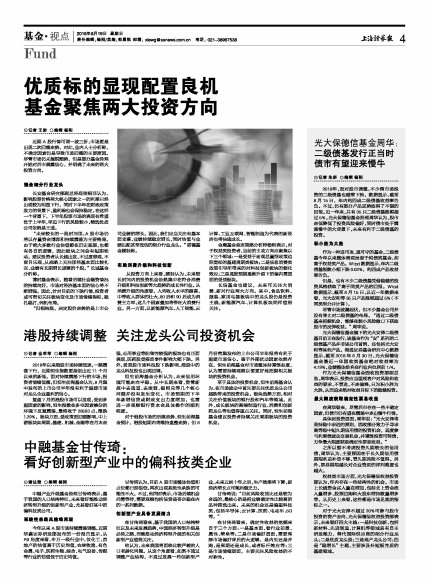 对于光大安泽不超过20%可参与股市投资的资产去向,光大保德信权益投资部表示,未来看好四大主线:一是科技创新,包括新材料、先进制造、计算机等领域具有自主研发能力、替代国际供应商的细分行业龙头;二是优质龙头股;三是地产龙头公司;四是“稳增长”主题,主要涉及补短板性质的基建领域。