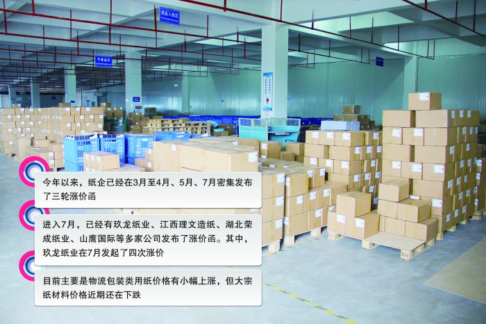 记者还注意到,今年以来,纸企已经在3月至4月、5月、7月发布了三轮涨价函。比如,玖龙纸业自4月1日起,所有白卡纸系列产品涨价200元/吨;自5月15日至20日,东莞、天津、河北、湖北、北海等多个基地的瓦楞纸、再生牛卡纸等多个品类价格每吨上调30元至50元不等。