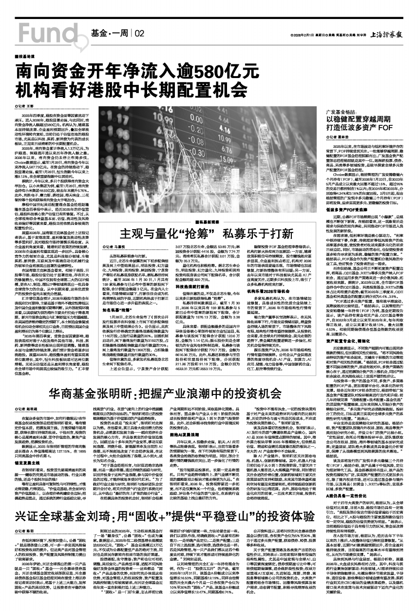 2025年四季度,港股在资金面等因素扰动下承压。进入2026年,港股显著走强,与此同时,南向资金净流入额超过580亿元。机构认为,随着基本面持续改善、企业盈利预期回升,叠加全球流动性环境转向宽松,当前仍处于估值洼地的港股市场,尤其是以科技、医药、新消费为代表的成长板块,正迎来日益清晰的中长期配置机会。