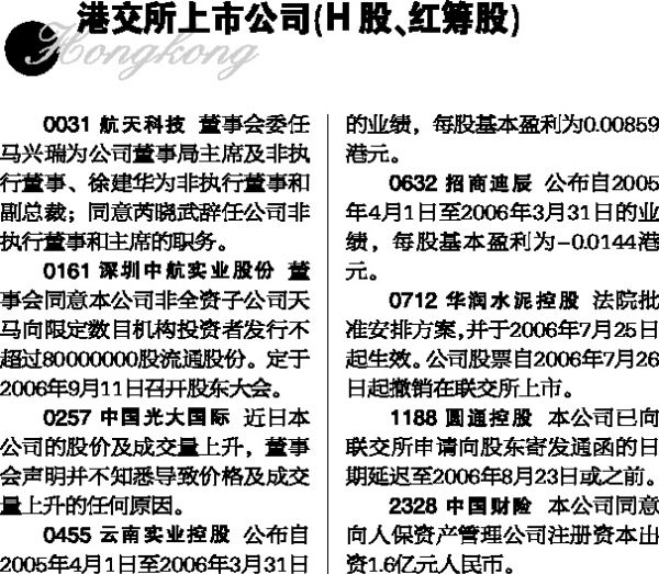 0031 航天科技 董事会委任马兴瑞为公司董事局主席及非执行董事、徐建华为非执行董事和副总裁;同意芮晓武辞任公司非执行董事和主席的职务。 0161 深圳中航实业股份 董事会同意本公司非全资子公司天马向限定数目机构投资者发行不超过80000000股流通股份。定于2006年9月11日召开股东大会。