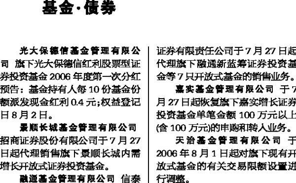 光大保德信基金管理有限公司 旗下光大保德信红利股票型证券投资基金2006年度第一次分红预告:基金持有人每10份基金份额派发现金红利0.4元;权益登记日8月2日。 景顺长城基金管理有限公司 招商证券股份有限公司于7月27日起代理销售旗下景顺长城内需增长开放式证券投资基金。