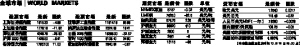 全球市场 WORLD MARKETS 期货市场 最新价 涨跌 单位 NYMEX原油 57.57 -0.02 美元/桶 LME铜 7425.0 -62.5 美元/吨 纽约期金 574.75 2.35 美元/盎司 沪铜主力 69820 410 元/吨 沪燃油主力 2900 5 元/吨 连豆主力 2441 -6 元/吨 郑棉主力 13115 -85 元/吨 货币市场 最新价 涨跌 欧元美元 1.2540 0.0017 美元日元 119.48 -0.22 人民币美元NDF(一年) 7.6390 -0.0026 国内国债7天回购 109.25 -0.05 美国10年期国债殖利率 4.767% -0.005% 美国30年期国债殖利率 4.893% -0.002% 股票市场 最新 涨跌 上海证券报指数 1615.33 -4.98 上证综合指数 1778.18 -11.92 深证成份指数 4348.76 -26.83 沪深300指数 1426.50 -9.41 香港恒生指数 17837.00 11.00 股票市场 最新 涨跌 道琼斯工业指数 11914.16 65.88 纳斯达克综合指数 2324.68 16.41 日经225指数 16368.00 -32.57 富时100指数 6108.40 34.90 新加坡海峡时报指数 2640.64 -0.97 (本表数据截至北京时间10月12日23:00点)
