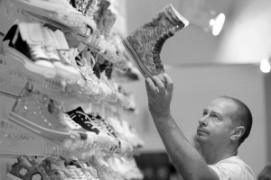 10月17日,一名采购商在广交会一家制鞋企业展位观看展品。 卢汉欣 摄
