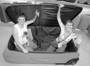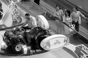 10月15日,两名采购商被一个大箱子深深吸引。 卢汉欣 摄
