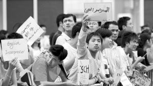 10月15日,在流花展馆外的翻译区,由广州各高校学生自由组成的翻译市场十分活跃。