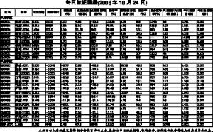 每日权证数据(2006年10月24日)代码 名称 收盘(元) 涨跌(元) 涨跌幅(%) 成交金额(亿元) 成交金额增减(%) 换手率(%) 标的证券收盘价(元) 溢价率(%) 隐含波动率(%) 离到期日时间(自然日) 今日涨停价(元) 今日跌停价(元)