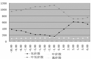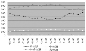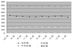 我们收集了5月30日、6月20日和8月15日前10个交易日以及5月30日和6月20日后6个交易日的股价结构情况,并把它们分为低价股(低于10元)、中低价股(10-30元)、中价股(30-80元)和高价股(80元以上)。