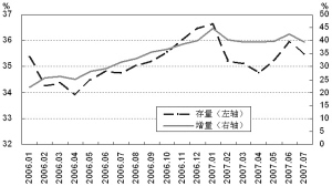 截至6月末,基础货币余额同比增长31%,比年初增加4896 亿元,同比多增6143 亿元。基础货币增速较高,主要与2006年下半年以来多次提高存款准备金率有关,因为按照现有统计口径,法定存款准备金计入基础货币,而央行票据不计入基础货币。如果2006 年以来由法定存款准备金率上调所冻结的流动性改由发行央行票据进行对冲,那么当前基础货币增速将低于10%。6 月末,金融机构超额存款准备金率为3%,同比降低0.08 个百分点。7月份银行间市场同业拆借月加权平均利率2.33%,比去年同期高0.02个百分点,质押式债券回购月加权平均利率2.53%,去年同期高0.35个百分点。