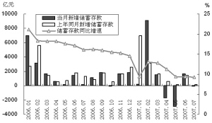 第二,股市持续分流居民储蓄存款。股票价格快速上涨带来的丰厚的资产收益将诱使居民调整资产组合,减少银行存款这样的货币资产,具体表现为储蓄存款向股市分流。股权分置改革引发的新一轮牛市,造成储蓄存款增速自2006年1月起持续下滑。2007年7月末,人民币储蓄存款同比增长9.23%,同比增速自2006年1月份的高点累计下降11.84个百分点。
