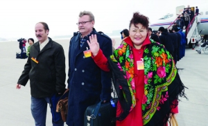 带着广大群众的心声和希望,出席全国政协十一届三次会议的政协委员1日陆续抵京,他们将在即将召开的盛会上履行政治协商、民主监督、参政议政的职责。图为新疆维吾尔自治区出席全国政协十一届三次会议的全国政协委员抵达北京。 新华社 图