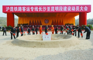 昨日,沪昆铁路客运专线长沙至昆明段在贵阳正式宣布开工。沪昆铁路客运专线长沙至昆明段是沪昆铁路客运专线的重要组成部分,线路全长约1167公里,线路设计时速为250公里。图为沪昆铁路客运专线长沙至昆明段奠基仪式现场。本报传真图