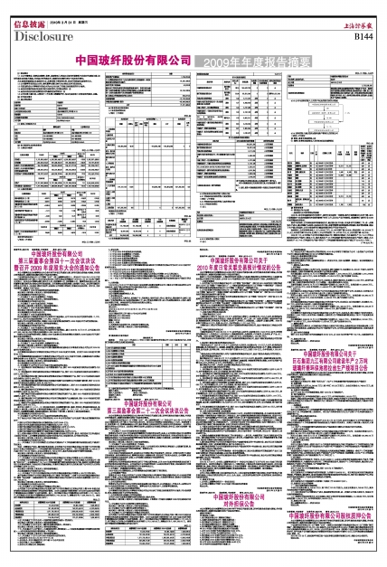 中国玻纤股份有限公司(以下简称“公司”)第三届董事会第四十一次会议于2010年3月29日在北京市海淀区西三环中路10号公司会议室召开,召开本次会议的通知于2010年3月18日以电子邮件方式发出。会议由公司董事长曹江林先生主持,应到董事9名,实到董事9名。董事常张利因公出差,委托董事长曹江林代为出席会议并行使表决权。公司监事会成员和高管人员列席了会议。会议的召集和召开符合《公司法》、《证券法》等有关法律、法规和《公司章程》的规定,所做决议合法有效。经审议,全体与会董事一致通过了如下决议: