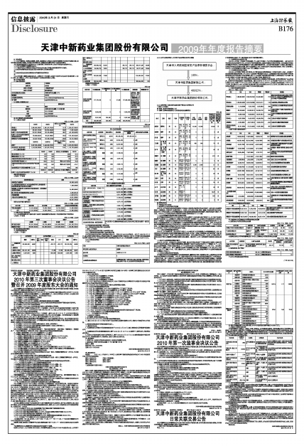 天津中新药业集团股份有限公司于2010年3月29日以现场与通讯相结合的方式召开了2010年第三次董事会会议。本次会议应参加董事9人,实参加董事9人。会议召开符合《公司法》、《证券法》和《公司章程》有关召开董事会会议的规定。会议形成如下决议: