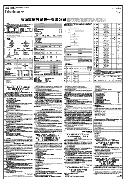 海南筑信投资股份有限公司(以下简称:公司)第六届董事会第五次会议于2010年3月26日在海南省海口市美兰区大英山西四路9号公司会议室召开。会议通知已于2010年3月16日以传真或送达方式发出。本次会议由董事长李爱国先生主持,应到9人,实到7人,董事王志国先生、王福林先生因公务未能出席,分别委托董事田淼先生代为出席,并行使表决权。公司部分监事、高管列席了本次会议。本次会议的召集、召开符合《公司法》及公司章程的有关规定,合法有效。会议以记名投票方式通过了如下决议: