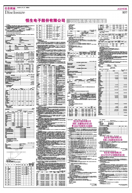 恒生电子股份有限公司(以下称“公司”)四届二次董事会于2010年3月31日在公司会议室举行。本次会议应到会董事11名,实际出席10名,独立董事张天富委托独立董事李尊农代为表决;监事3名列席,董事长彭政纲先生主持了本次会议。根据《公司法》和公司《章程》有关规定,会议合法有效。