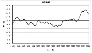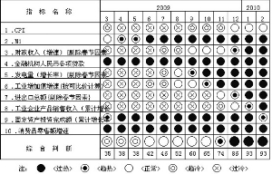 1-2月份,10个警情指标中,M1月末余额同比增速、金融机构人民币各项贷款月末余额同比增速、发电量、工业增加值和社会消费品零售总额当月实际同比增速等6个指标继续处于“过热”的红灯区; 财政收入增速从1月开始进入红灯区;进出口总额增速在2009年12月进入“黄灯区”,2010年1月进入红灯区;工业企业产品销售收入1月进入“黄灯区”,2月进入红灯区运行;城镇固定资产投资完成额累计增速由过热的“红灯区”进入趋热的“黄灯区”;CPI继续在绿灯区上行,进入绿灯区中部。
