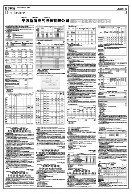根据《公司法》、《深圳证券交易所股票上市规则》和《公司章程》的规定,宁波新海电气股份有限公司(以下简称“公司”)第三届董事会第六次会议决定于2010年5月13日在公司会议室召开2009年度股东大会,有关具体事项如下: