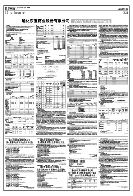通化东宝药业股份有限公司第六届董事会第十次会议,于2010年4月13日以通讯方式召开,会议通知于2010年4月3日,以送达、传真、电子邮件、电话等形式发出,本次会议发出表决票9张,收回表决票9张,符合《公司法》和公司章程的规定,所作决议合法有效。会议逐项审议并通过了如下决议: