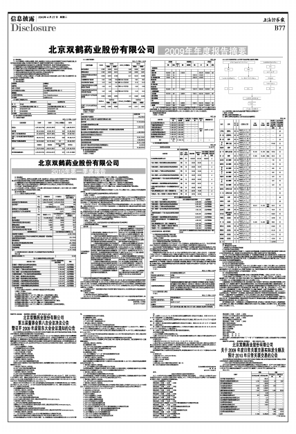 北京双鹤药业股份有限公司2009年年度报告摘要