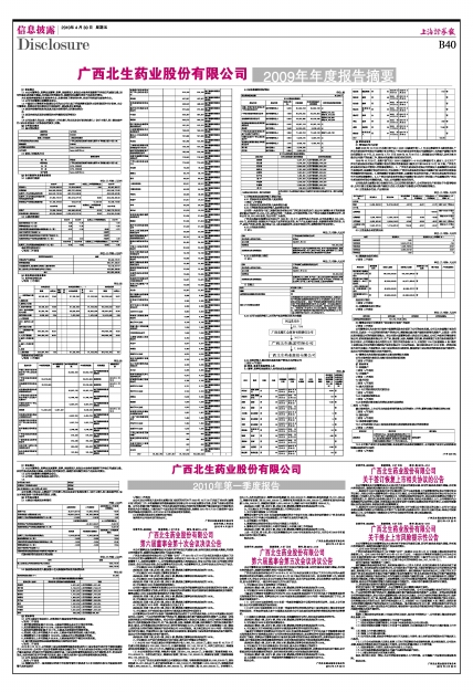 广西北生药业股份有限公司(以下简称“公司”)于2010年4月18日以电话及传真方式发出了关于召开公司第六届董事会第十次会议的通知,本次会议于2010年4月28日在公司会议室召开。会议应到董事7人,实际到会董事7人,公司监事和高级管理人员列席会议,符合《公司法》及《公司章程》的有关规定,会议召开合法有效。会议由董事长何京云主持,与会董事经审议,以举手表决方式作出以下决议:
