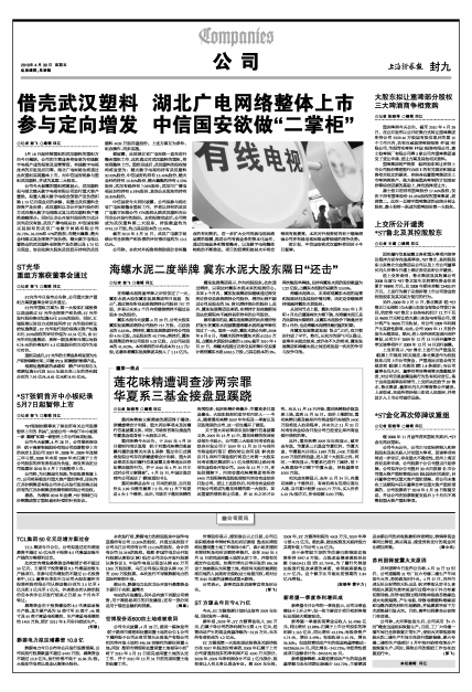 中信国安今天同时披露,公司拟参与湖北省广电网络整合重组工作,并将以持有的武汉广电数字网络公司47%股权认购武汉塑料向公司非公开发行的股份。本次投资完成后,公司将成为武汉塑料第二大股东,持股数量约为4745.19万股,约占其总股本的12.40%。