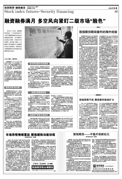 截至4月29日,沪深两市融资融券总额达3.73亿元,融券比率仍在上升,做空市场的投资者仍在增加。4月30日,沪深300现指的午后拉升给市场带来了短线反弹的曙光。五一节假期间,我国央行宣布年内三度上调存款准备金率,在目前偏弱的氛围下,市场心理处于惊弓之鸟状态,因此这一不大不小的利空对股市短期影响仍偏负面。中信证券在上海市场多只ETF 产品中具有较高的权重,股票停牌期间,证券指数下跌幅度较大,市场预期中信证券复牌对ETF 净值有着负面的影响,因此上周上海市场ETF 普遍折价交易。昨日,上证180ETF成交额近2.586亿元,较上一交易日增加了12.7%。中信证券节后复牌即跌停带动券商股下挫,短期内仍有下跌的可能,因此存在着拖累现指继续下行的动力。