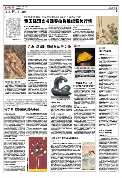 他又强调,判断书画行情走势不能光是从一两件拍品来看,而要从总体上看。他断言,换一种说法,把各拍卖公司成交过千万的拍品总数加起来,今年春拍一定会是去年秋拍的几倍,有可能是去年秋拍的5倍。