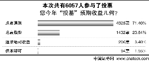 上周,中国证券网进行了“您今年‘投基’预期收益几何”的调查,共有6057人参与了投票。结果显示,4325名投票者选择了“跑赢通胀”,这部分投票者占全部投票人数的71.40%;与此同时,有1432为投票者选择了“跑赢指数”,该部分投票者占全部投票人数的23.64%;206名参与者选择了“追求绝对收益”,占比3.40%;仅有94位参与者将今年投资的预期收益定位在“保本即可”,这部分占全部投票人数的1.55%。