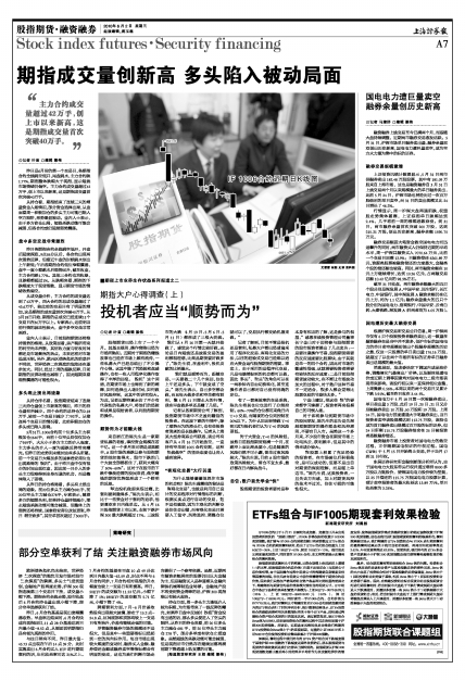 记者从各家期货公司了解到,股指期货市场中不乏盈利翻倍的投资者。在这波下跌的行情中,除了顺势而为的滑头们,也有些投资者秉承的是长线操作。记者从上海某大型券商系公司获悉,该公司有客户从4月16日开始放空,一直持有空单到1005合约交割,这种“长线做空”的坚决态度也让旁人感到诧异。
