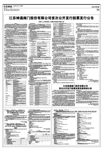 江苏神通阀门股份有限公司(以下简称"发行人")首次公开发行不超过2,600万股人民币普通股(A股)将于2010年6月7日分别通过深圳证券交易所交易系统和网下发行电子化平台实施。发行人、保荐人(主承销商)特别提请投资者关注以下内容: