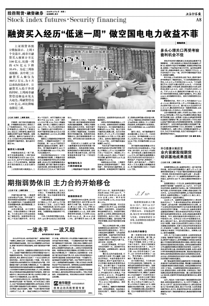 由于交割日临近,主力多头和主力空头纷纷加快了离场步伐。长城伟业和国泰君安双向减仓,国泰君安逢低减持空单618手,已是连续三个交易日减空。这种坚决的减空态势还较为少见,据统计,国泰君安三日总共减持了47%的空单合计1600余手,其空单已大幅下降到2000手以下,不再具有压倒性优势。前10位多头主力减仓363手,前10位空头主力减仓219手。现指短线仍有走弱的可能,业内人士表示,不排除期指近期出现反弹的可能,但从中线看依然有很大的下降空间。