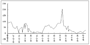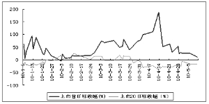 上市首日涨幅比较高的新股,往往上市后表现比较差。我们观察上市首日新股的涨跌幅与去除首日后上市20日后的涨跌幅(见图2)发现两者有反相关的关系。新股上市首日表现比较好,但是上市后一段时间内却表现比较差,相反,某段时间内新股上市首日表现比较差,但在上市后的一段时间内表现却相对比较好。例如,在1月上旬上市的新股,首日表现比较好,但随后20日天内表现却比较差,4月中旬,新股曾经达到疯狂的状态,但这批新股在上市后的表现却不尽人意,比如,新亚制程上市首日开盘涨幅达到300%,但是随后20天内下跌了37%,同天上市的黑牛食品和南洋科技上市20天内也分别下跌了40%和41.6%,下跌可谓惨烈。相反,在某段时间内上市首日表现不佳的新股,在上市后反而表现比较好,比如在2月份上市的新股虽然上市首日表现不佳,但是上市后表现却比较好,比如二月份上市的杰瑞股份、森源电气、鼎龙股份、蓝色光标、蓝色光标、万邦达、汉王科技上市20天内涨幅均超过20%。
