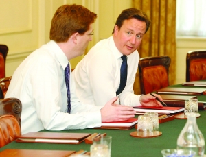 6月21日,英国伦敦,英国首相卡梅伦(左二)、副首相克莱格、财政大臣奥斯本与财政部第一副大臣亚历山大(左一)在唐宁街10号召开会议,讨论即将于22日公布的紧急财政预算案。