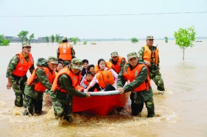 受近日强降雨天气影响,江西等南方部分地区发生严重洪涝灾害。党中央、国务院对此高度重视,胡锦涛总书记、温家宝总理多次作出重要指示,要求把保障人民群众生命安全放在第一位。6月21日晚,受持续强降雨影响,江西抚河暴发特大洪水,临川区唱凯堤出现决口,威胁下游群众。图为武警官兵紧急转移群众。 新华社 图