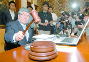 7月9日,韩国中央银行——韩国银行召开金融货币委员会例会,宣布将基准利率上调0.25个百分点至2.25%。这是韩国央行自2008年8月份以来首次上调基准利率,被认为是韩国正式开始实施退出战略的信号。图为韩国中央银行行长金仲秀在首尔主持金融货币委员会例会。 相关报道详见6版 本报传真图