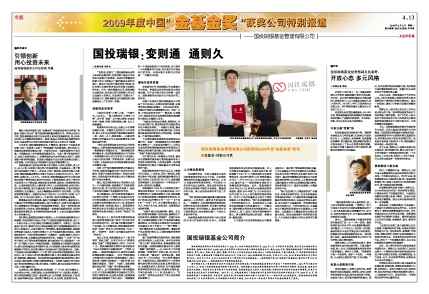 感谢上海证券报第七届“金基金奖”评选委员会将2009年度“金基金·创新公司大奖”授予给国投瑞银基金管理公司。刚刚过去的六月里,国投瑞银基金也刚巧迎来合资五周年的发展新阶段,在五年多时间里,公司能够两次获得这一殊荣,既是公司坚持创新战略的韧性体现,也是业界对公司努力坚持创新引领行业之先的认可与鼓舞。