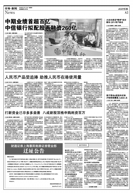 中期业绩首超百亿 中信银行拟配股再融资260亿
