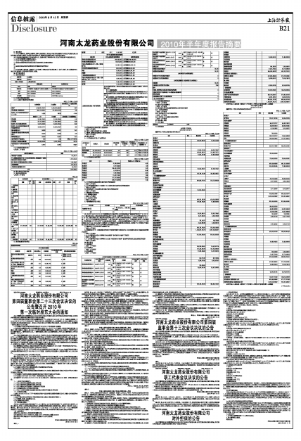 河南太龙药业股份有限公司2010年半年度报告摘要