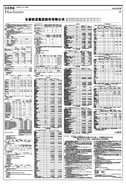 长春欧亚集团股份有限公司第六届董事会于2010年8月3日以书面送达的方式,发出了召开第六届董事会第十一次会议的通知。并于2010年8月13日上午8:30时在公司第二会议室召开了六届十一次董事会。应到董事9人,实到7人。公司副董事长兼总经理曲慧霞因公出差、独立董事冯淑华因事未能参加会议。公司监事和高管人员列席了会议。会议符合公司法和公司章程的有关规定。经与会董事审议,以全票通过了如下议案。