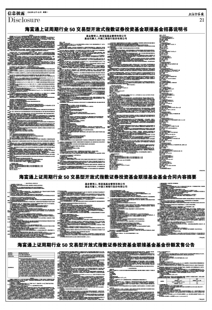 11.本公告仅对本基金发售的有关事项和规定予以说明。投资人欲了解本基金的详细情况,请详细阅读刊登在2010年8月16日《中国证券报》、《证券时报》和《上海证券报》上的《海富通上证周期行业50交易型开放式指数证券投资基金联接基金招募说明书》。