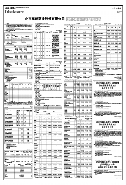 股票代码:600062 股票简称:双鹤药业 编号:临2010-018