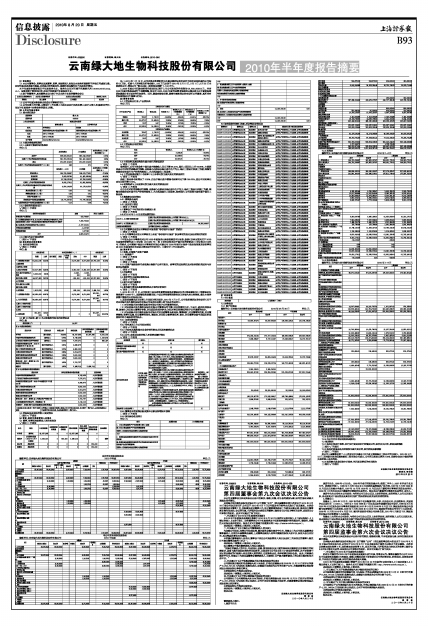 云南绿大地生物科技股份有限公司(以下简称“公司”)第四届董事会第九次会议于2010年8月18日在公司会议室召开,公司已于2010年8月7日以书面及电子邮件方式发出了会议通知。本次会议应参加会议董事7名,实际参加会议董事6名,独立董事谭焕珠因工作原因未能出席,委托独立董事黄文锋代为表决,会议的召集、召开程序及出席会议的董事人数符合《公司法》等有关法律、法规和《公司章程》的规定。会议审议通过了如下决议: